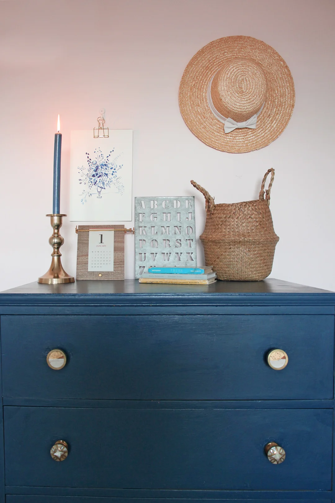 Once you have collected your items together you can start adding them to the display. I always start with the larger props that will sit in the background, here I’ve used a medium sized basket, my straw hat from Greece (it reminds me of holidays), a vintage alphabet stencil, a print by Peggy & Kate, and my new calendar.